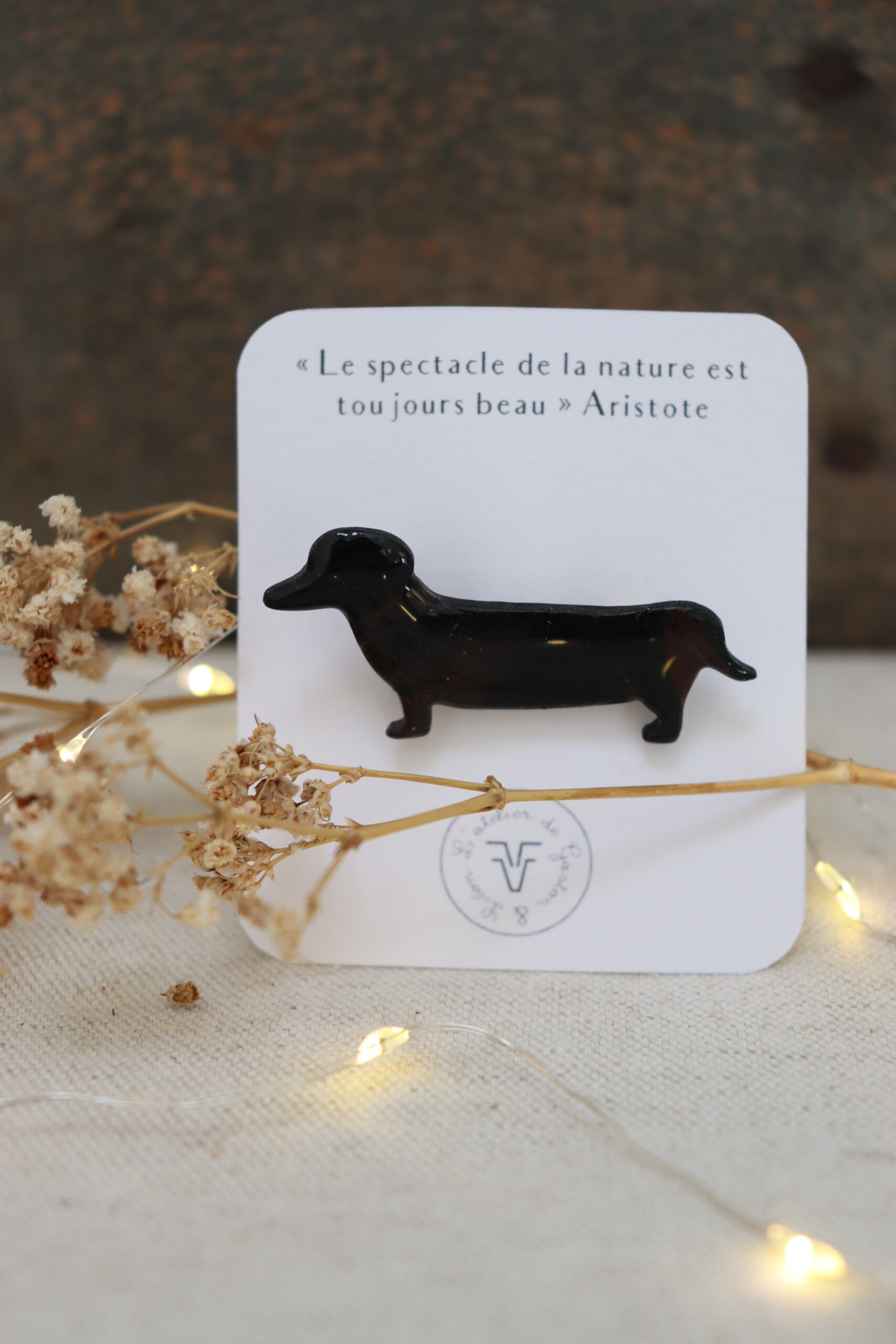 Un joli teckel à porter sans modération, pour apporter une touche de fantaisie sur un pull, un chapeau ou un sac !